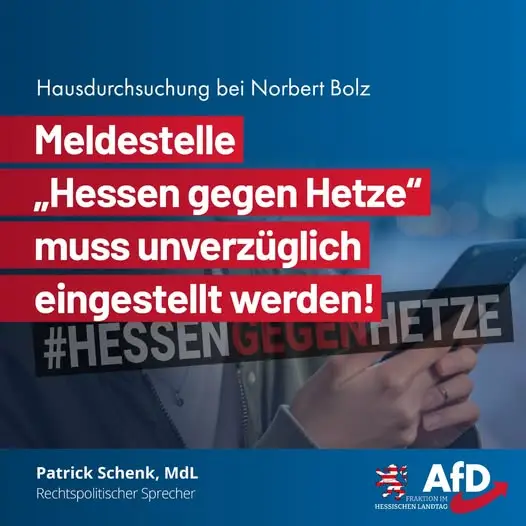Nach Hausdurchsuchung bei Norbert Bolz: Meldestelle „Hessen gegen Hetze“ muss unverzüglich eingestellt werden! Die Staatsanwaltschaft Berlin hat eine Hausdurchsuchung beim renommierten Medienwissenschaftler Norbert Bolz wegen eines kritischen Beitrags zur „Woke“-Bewegung auf der Plattform „X“ durchgeführt. Auslöser dafür war nach Angaben der „Berliner Zeitung“ die staatliche hessische Meldestelle „Hessen gegen Hetze“.