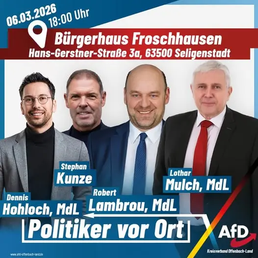 Am 06. März in Seligenstadt-Froschhausen erwarten wir hochkarätige Abgeordnete und Redner unserer Partei, welche uns im Kommunalwahlkampf vor Ort unterstützen.